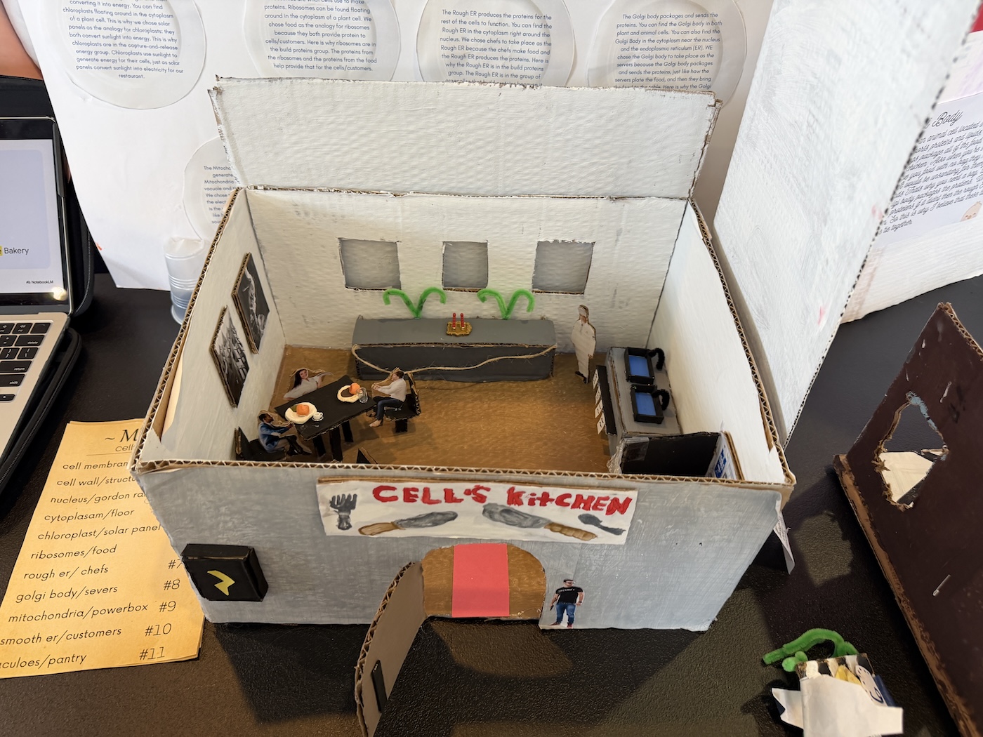 When the project launched in January, students began a multi-week process that blended scientific writing, inquiry, and design. They crafted detailed analogy paragraphs for each organelle, explaining how it functions within a cell, how it connects to a chosen system, and why that comparison holds true. Through structured feedback cycles and revision, their thinking became increasingly refined and sophisticated.