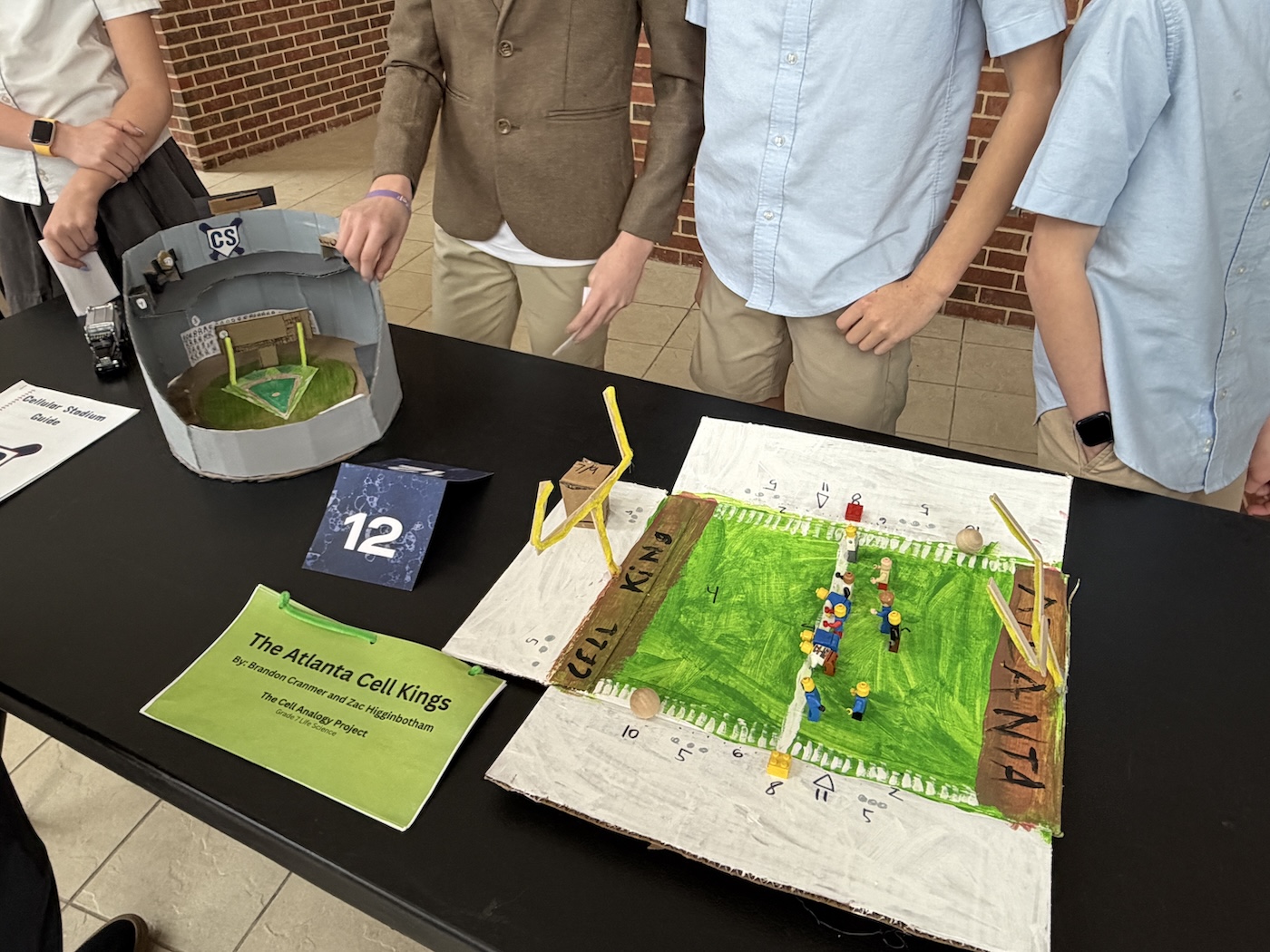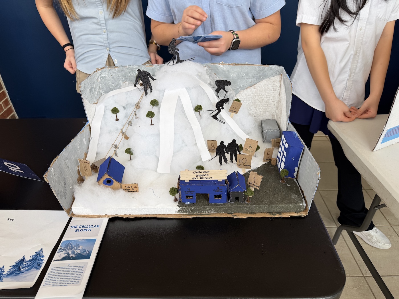 The Cell Analogy Expo, held just before spring break, served as the culminating experience, where students presented their work to an authentic audience. The range of analogies reflected both imagination and depth of understanding, with projects drawing connections between cells and circuses, ski resorts, drones, botanical research domes, and even the inner workings of an iPhone.