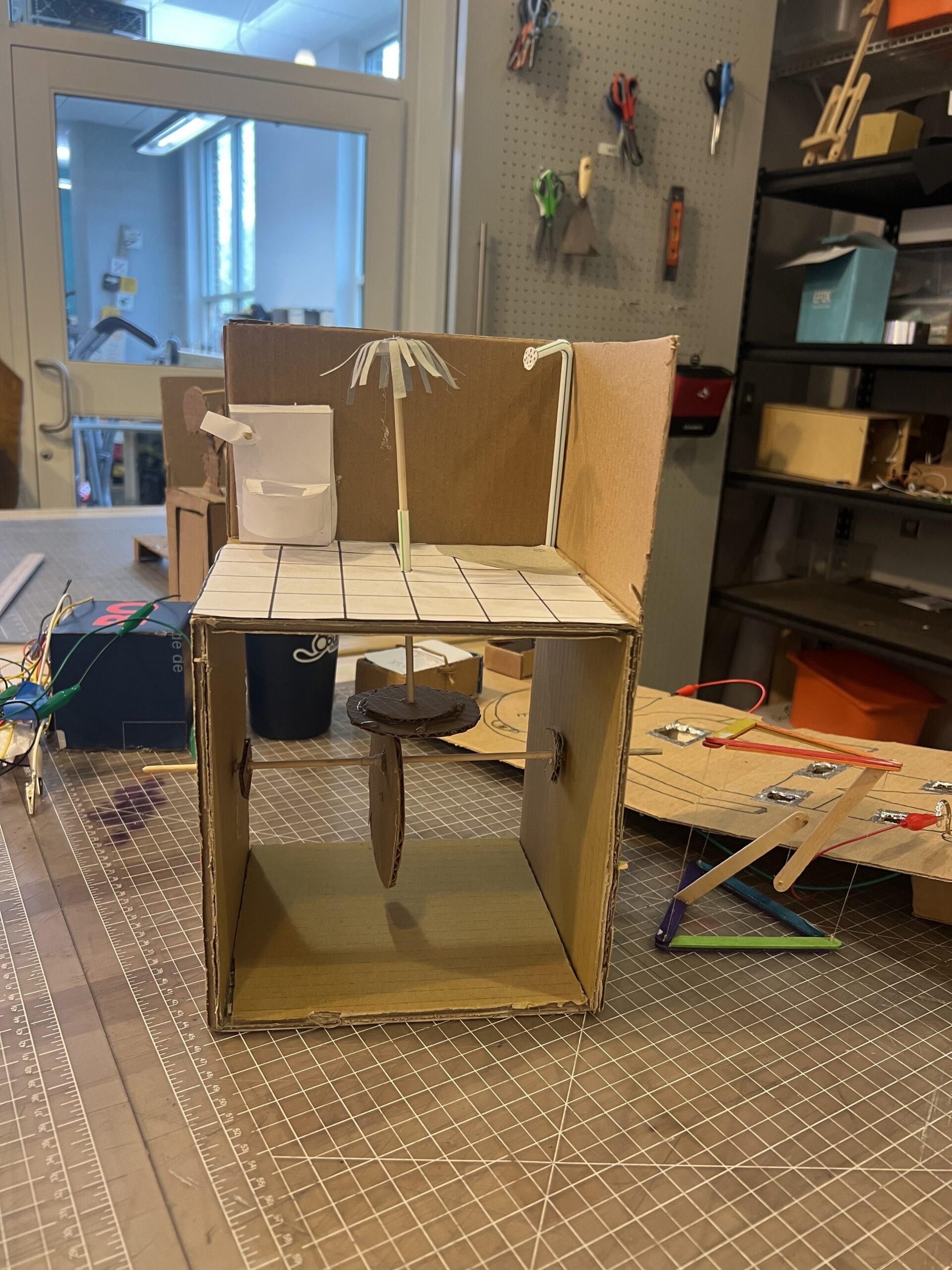 In another case, a student applied those same maker skills to a Humanities project, designing a prototype for a self-cleaning bathroom to support unhoused populations. The result wasn’t just a model, it was a tangible expression of empathy, systems thinking, and problem-solving. Isabel Varano explains, “using the automata build was a more effect way to show how my design works rather than just writing about it.”